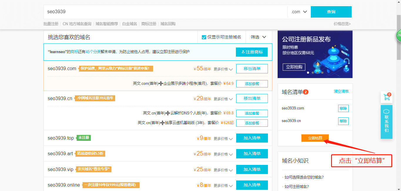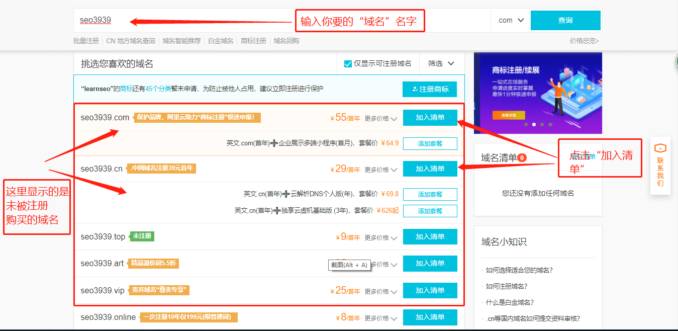 1.3、然后找到未被注册购买的域名,点击“加入清单”