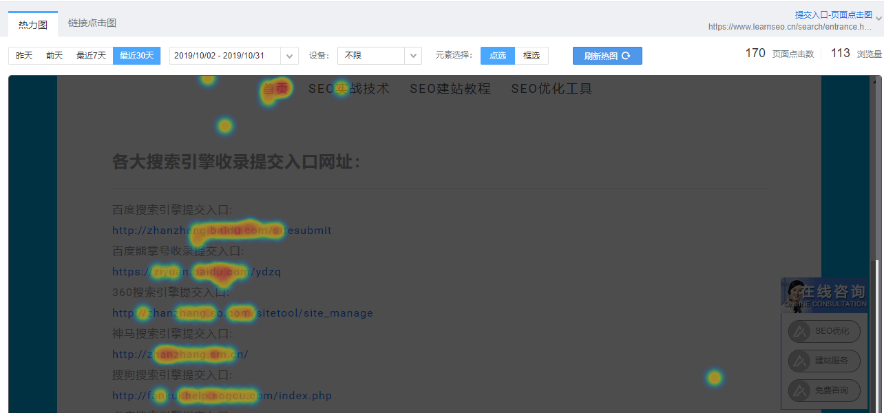 综上所述,热力点击图是一个很好的用户需求分析工具,通过这个工具,我们直观地了解到我们网站的访客最喜欢的内容,让我们可以针对性地展开下一步的SEO品牌推广优化策略。