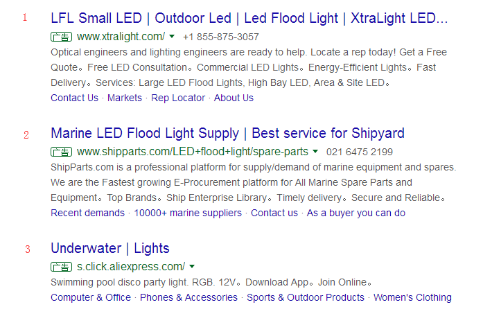 如上,谷歌搜索“LED Flood Light”,我们看到三家同行在做推广。假设他们的出价如下: