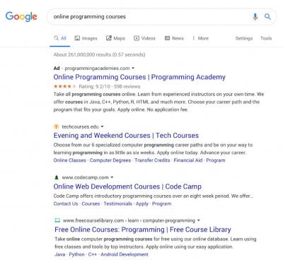 在同一天,也是十三日,Google 宣布,去年也就是2019年在移动设备上所使用的新界面,会在桌面上采用。主要的就是会在搜索结果中,显示域名,以及知名品牌的图标,以及粗体显示的 Ad 标志。样例如下。