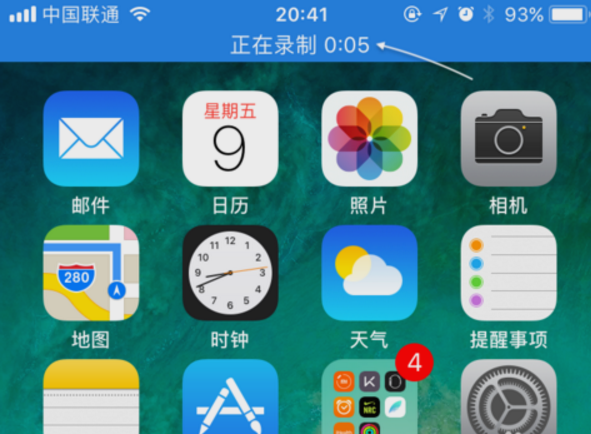 随后会看到屏幕顶部有蓝色的录制状态显示,如下图所示。