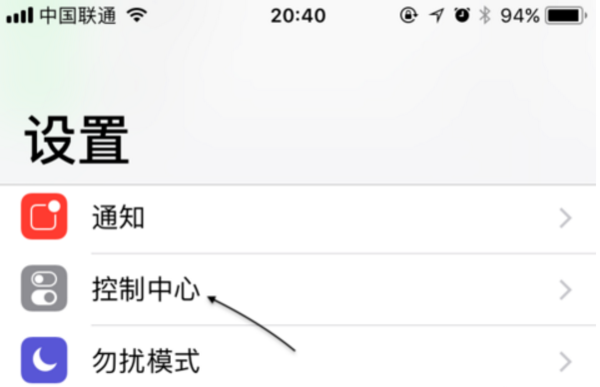 屏幕录制功能是被集成在控制中心里的,而在默认情况下,又是未添加到控制中心里,所以需要去手动添加。首先请依次进入「设置-控制中心」,如图所示。