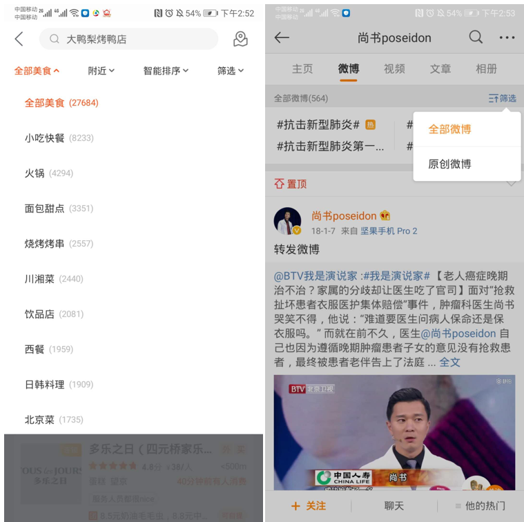 列表式筛选的特点是占用空间小,需要用户点击才会展示对应的筛选项。列表式的好处是,可以在有限的页面空间中展示更多的筛选维度。比如在大众点评的列表式筛选,在美食频道中,通过附近、美食、智能排序列表可以对美食进行相应的筛选。在微博中,个人主页的微博点击筛选列表可以选择原创和全部微博。