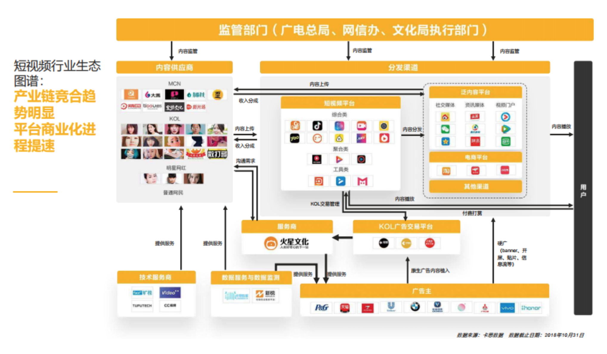 经过几年的发展,短视频产业链的搭建已经基本完成,包括行业监管部门(广电总局、网信办、文化局执行部门)、内容生产者(UGC、PGC和PUGC)、视频发布平台(移动短视频APP、内容分发平台、传统视频平台)、广告主、技术支持平台和用户等要素的完整产业生态已经初步建立,为短视频行业的健康发展奠定的良好基础。