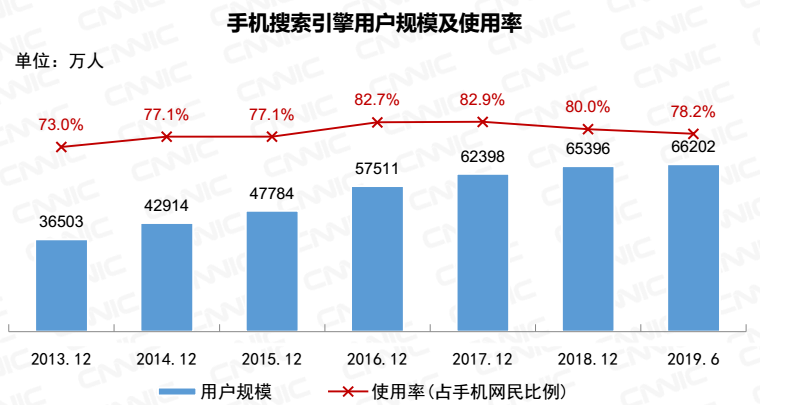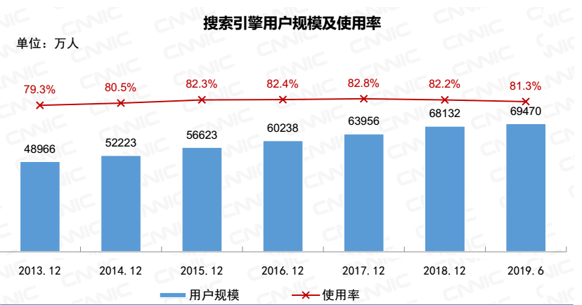 截至2019年6月,我国搜索引擎用户规模达6.95亿,较2018年底增加1338万;搜索引擎使用率为81.3%,较2018年底下降0.9个百分点。
