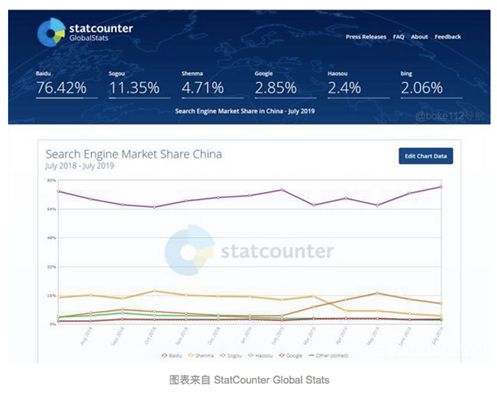 根据截止到2019 年7月中国搜索引擎全平台市场占有率数据来看,百度为 76.42%,搜狗为 11.35%,神马为 4.71%,谷歌为 2.85%,好搜为2.4%,必应为 2.06%。