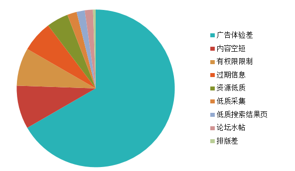从上图我们看出,目前低质网页中最严重的问题即因广告过多、占据网页主要位置以及超预期弹窗带来的浏览体验差,内容空短、网页需要权限才能获取资源和过期信息也是低质网页的重要组成部分。