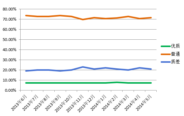 为了保证搜索质量、提高用户使用满意度,百度搜索引擎每周都会进行网页质量抽样评估。然而从近一年的评估数据中我们发现,优质网页的绝对数量非常少,且几乎没有增长;普通网页的占比在下降,相应的,质差网页的比例却有明显上涨。截至2014年5月,统计数据显示,在百度网页搜索发现的海量网页中,优质网页仅占7.4%,质差网页高达21%,其余普通网页为71.6%。