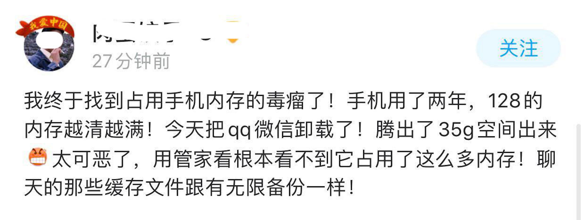 在使用手机的过程中,大家肯定发现了一件令人非常惊讶的问题,我们大多数人的手机上基本都已经安装了QQ和微信这两款软件,大家使用一段时间以后就会惊奇的发现,这两款软件占据了我们手机储存的大部分空间,甚至近日有网友惊奇的发现,自己128G储存空间的手机居然出现储存不足的情况,删掉QQ和微信以后突然就腾出了35G空间出来,这让用户非常意外,好奇这35G数据到底是什么东西?