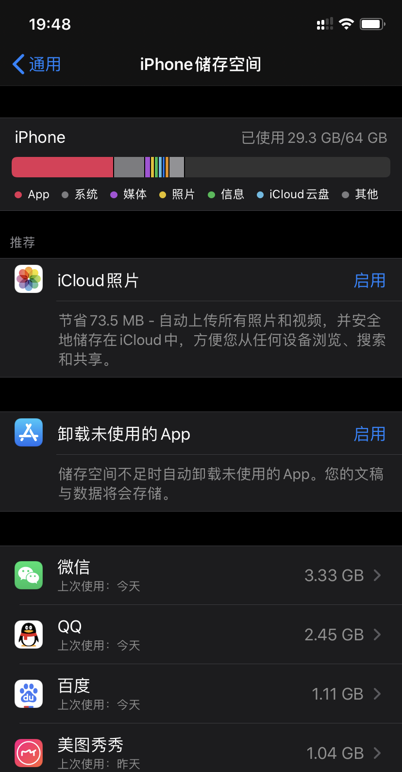 事实证明,64G储存空间确实已经开始不够用了。笔者手中是一台64G储存空间的iPhone11,即使我不爱拍照,不喜欢打游戏,也已经使用了近30G的储存空间,除去系统文件占据了近9G的储存空间以外,还有其他59款应用程序也占据了20G左右的储存空间,而QQ和微信就占据了6G的储存空间。