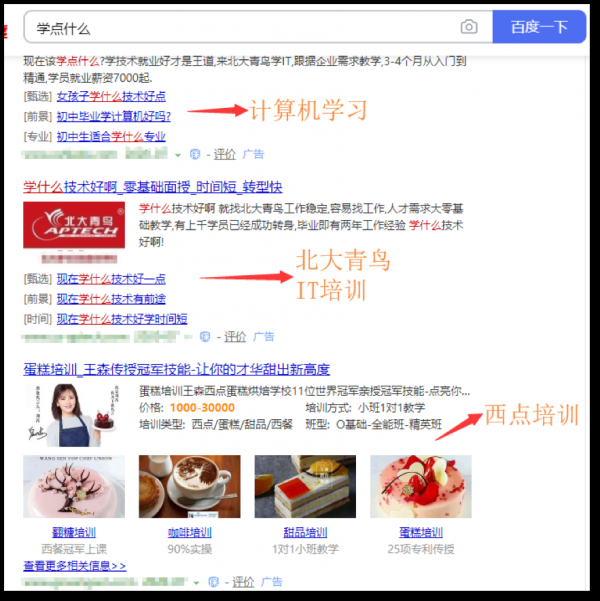 上图是十日后在百度搜索引擎搜索:学点什么得到的结果,我们就用这个做一个对比,由于十日后本身是处互联网行业的用户,自然会被前两个互联网相关的搜索结果所吸引,而下面的西点培训由于十日后本人并没有太大兴趣,所以会选择性忽略掉这条消息,再加上我本身就有计算机基础,就会优先选择第二条信息点击。