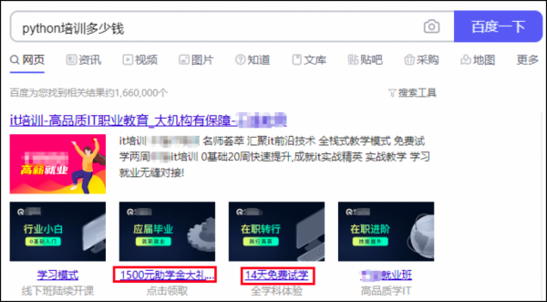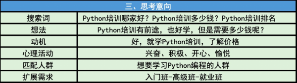在搜索引擎搜索了非常多的IT类培训,用户最终选择了Python做为学习目标,于是就开始在搜索引擎搜索Python相关的培训机构哪里好,多少钱,这段时间是各位SEMer最需要帮网民巩固需求的时候。