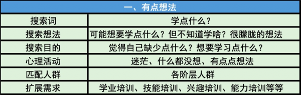 如上图可以得出结论,当用户在搜索学点什么的时候,用户单纯的只是想学点东西,但是并没有明确的目标,不清楚自己的需求是什么,十日后推荐各位SEMer这时候要做到的是给用户:制造需求。