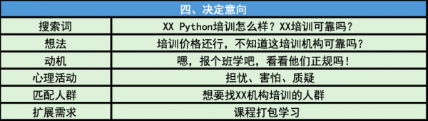 这个时候的网民大多已经有了需求,会有目标的区搜索,就觉得IT培训好像还不错啊,我要去搜索一下了解一下,这种时候各位SEMer需要考虑的是,用户会怎么搜,十日后一般会拓展性的做一些词,比如IT培训出来好找工作吗、IT培训前景怎么样、小白可以学懂IT吗,这类词会再一次加深用户的需求。
