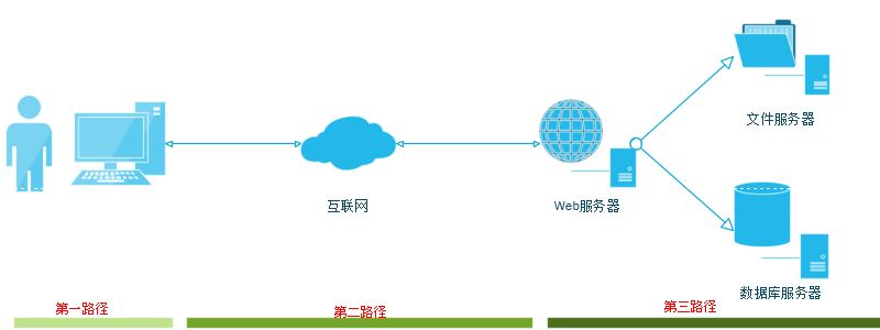 用户访问网站 的 整个流程 :用户输入网站域名,通过 DNS解析 ,找到目标服务器IP,请求数据经互联网达到目标服务器,目标 服务器 收到请求数据,进行 处理 (执行程序、访问数据库、文件服务器等)。处理完成,将响应数据又经互联网返回给用户浏览器, 浏览器 得到结果进行计算 渲染 显示给用户。如上图所示, 我们把整个过程,分为三段路径: