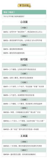 首先,是有逻辑:这个课程详情页将课程划分为了四大部分——即概述、心法篇、技巧篇、工具篇,而这四部分的排列就是一个人掌握写作技能的路径。