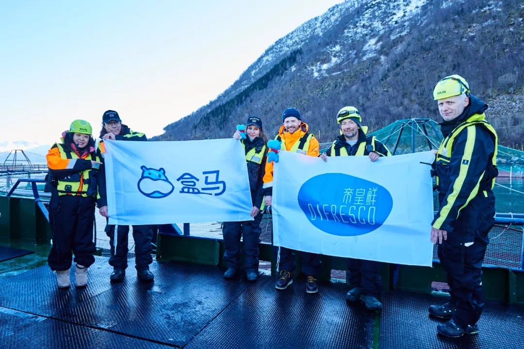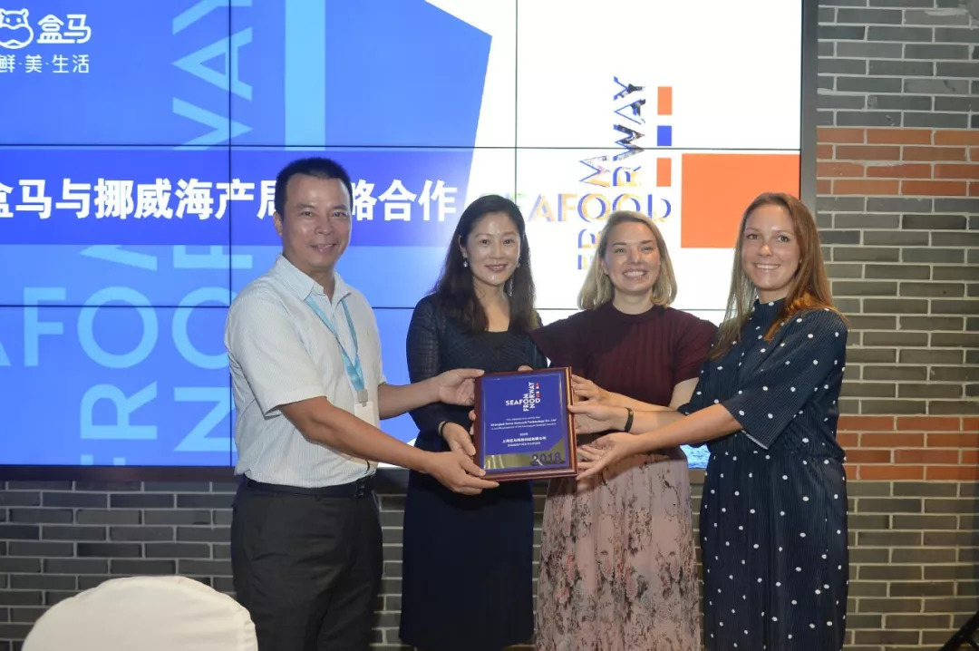 8月21日,盒马鲜生和挪威海产局签约,就正宗的挪威三文鱼供销达成合作。左二为津艺,右二为挪威海产局中国内地及香港地区总监博薇娅。
