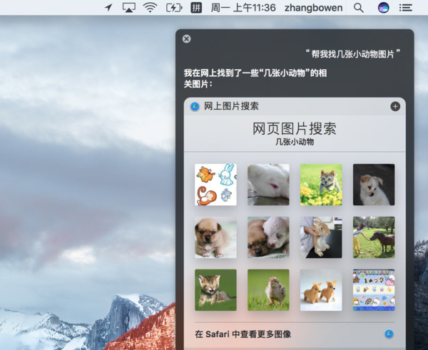 我对 Siri 说:帮我找几张小动物图片。于是 Siri 以 “几张小动物” 为关键词帮我搜索了图片。