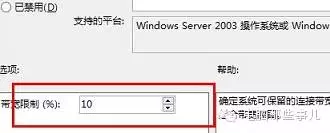 3.首先,在配置状态这一栏,咱们将原本的设置更改为“已启用”,然后找到线面的带宽限制,将原本的,80%更改一下,小编这里修改成了10,大家也可以根据自己的情况来设定,之后保存设置,退出窗口即可。
