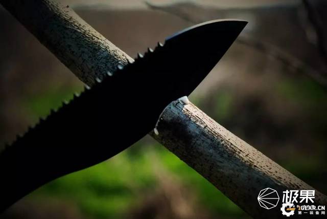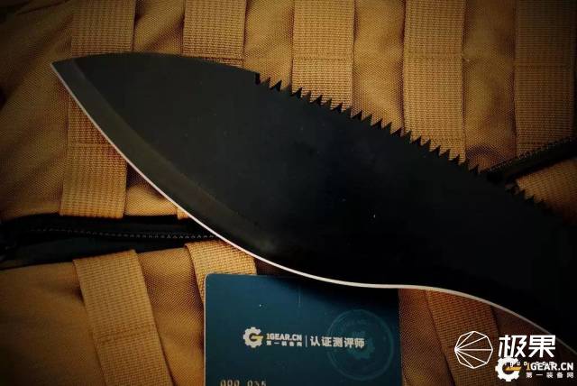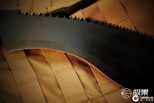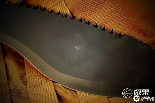 刀刃部分曲线销魂,打磨精细,无缺无花。占刀背2/3以上长度的双排锯齿视觉冲击感非常强。