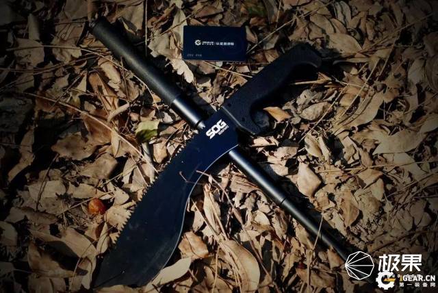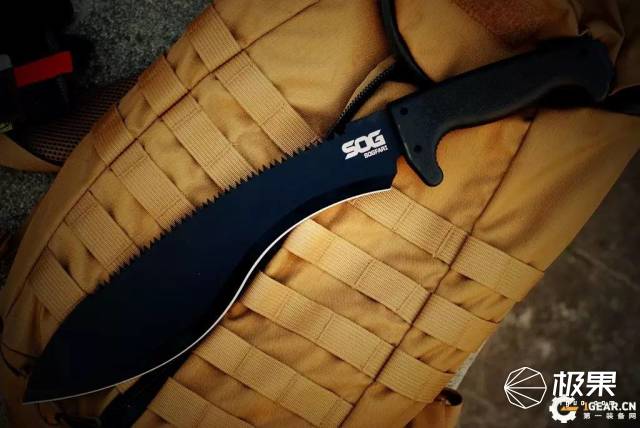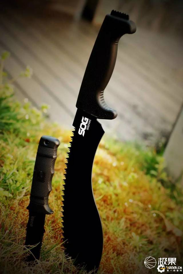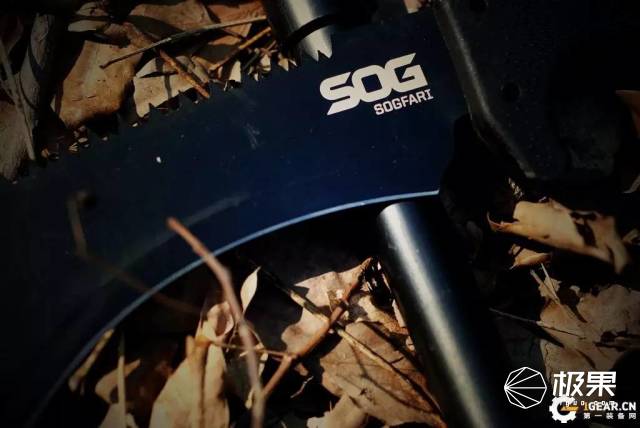 注视SOG大狗腿的第一瞬间,脑海里冒出的就是“很黑很暴力”,刀刃的造型倒是有里心理预期,反弧造型有超乎想像的力量和暴力美感。超过2/3刀背长度的巨大双排齿木锯,给人已强烈的视觉冲击感。