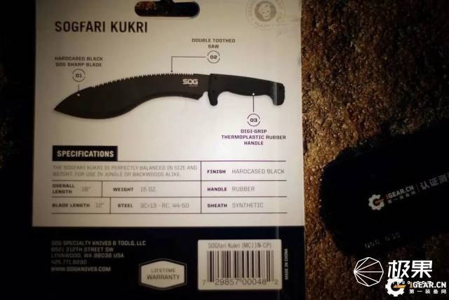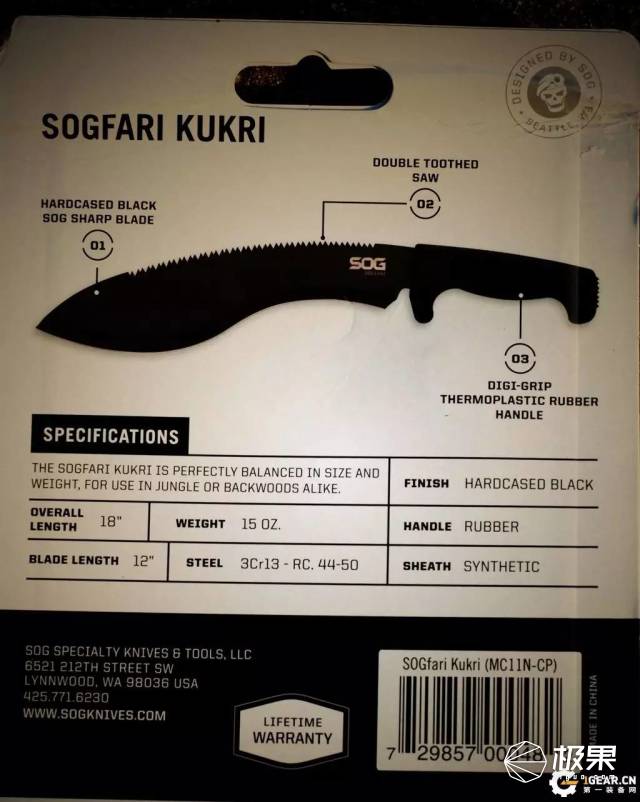 包装上详细表明了MC11的各种参数,由于数据敏感,后面的测评中就不会实际测量了。全长18英寸、刃长12英寸,重量15OZ,425克左右,说实话对于这个尺寸的开山刀来说重量不算重,认真看了下说明,SOG自个对MC11的定位也是尺寸和重量的完美平衡,足够日常使用,同时不会带来太大负担。