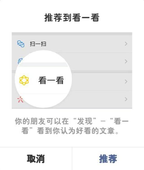 公众号文章底部的「点赞」按钮换成了「好看」,当你点击了某篇文章的「好看」,它都会出现在好友的「看一看」里,原来的信息流「精选」放在了第二个tab里。