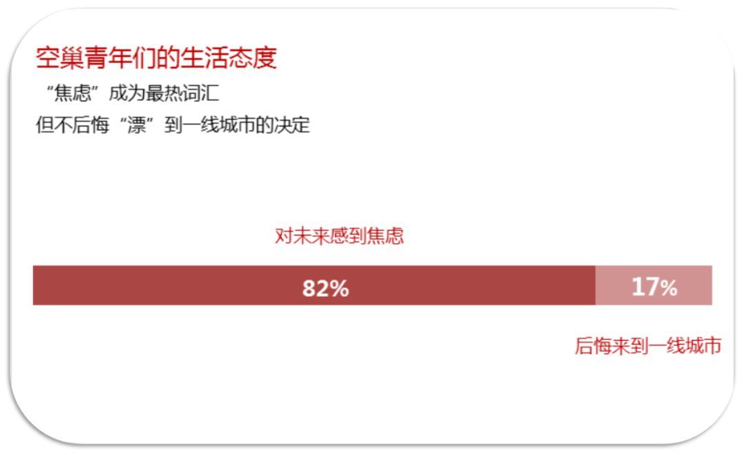 ? 压在探探空巢青年身上的三座大山:没房/单身/迷茫。有82%的人认为对未来感到焦虑,在一线城市单打独斗艰辛,但他们却很少后悔 (仅占17%)。