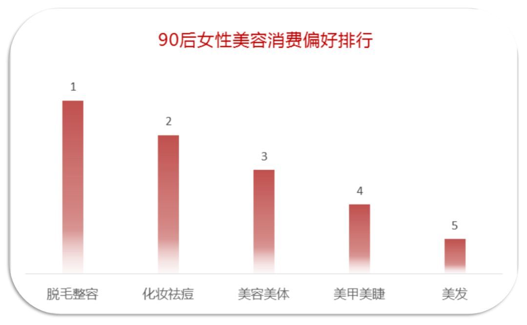而90后女性则倾向面部整形与美容类消费,脱毛整形、化妆祛痘、美甲美睫挤入榜单前五。