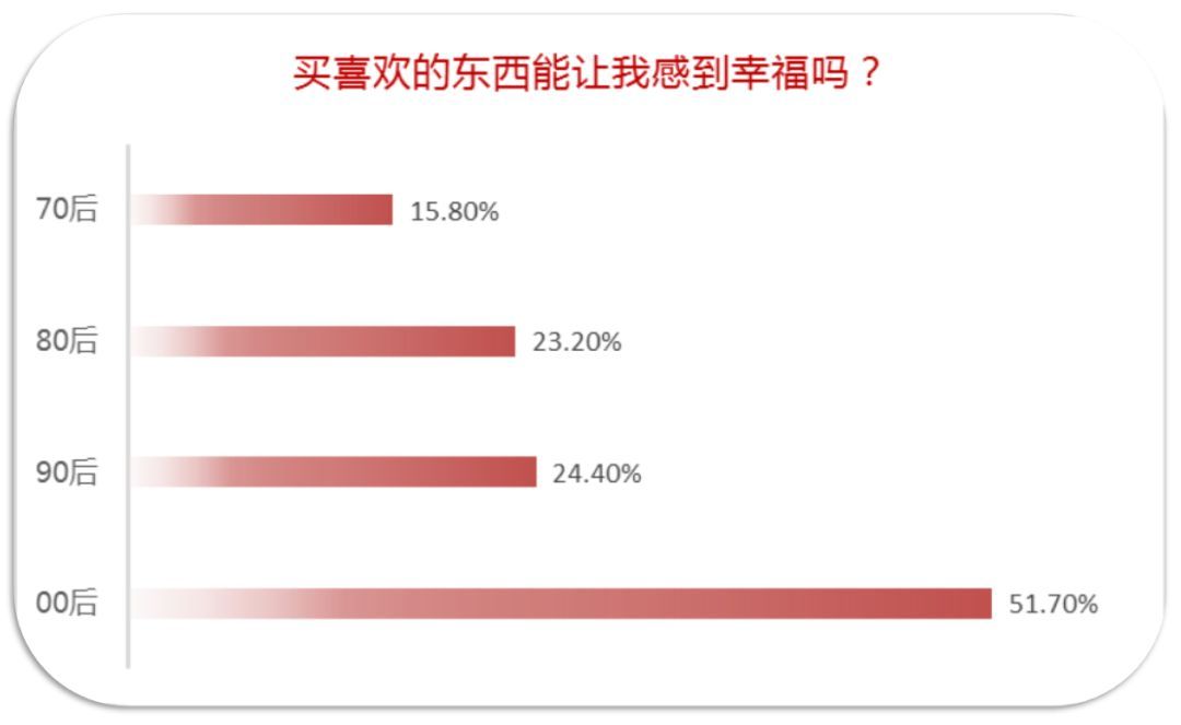 ? 幸福感来之不易,年龄层对消费购物所获满足感存在差异,年龄越小似乎对于消费刺激越敏感。半数以上00后越买越幸福。90后与80后敏感度相差甚微,分别占比23.20%与24.40%。