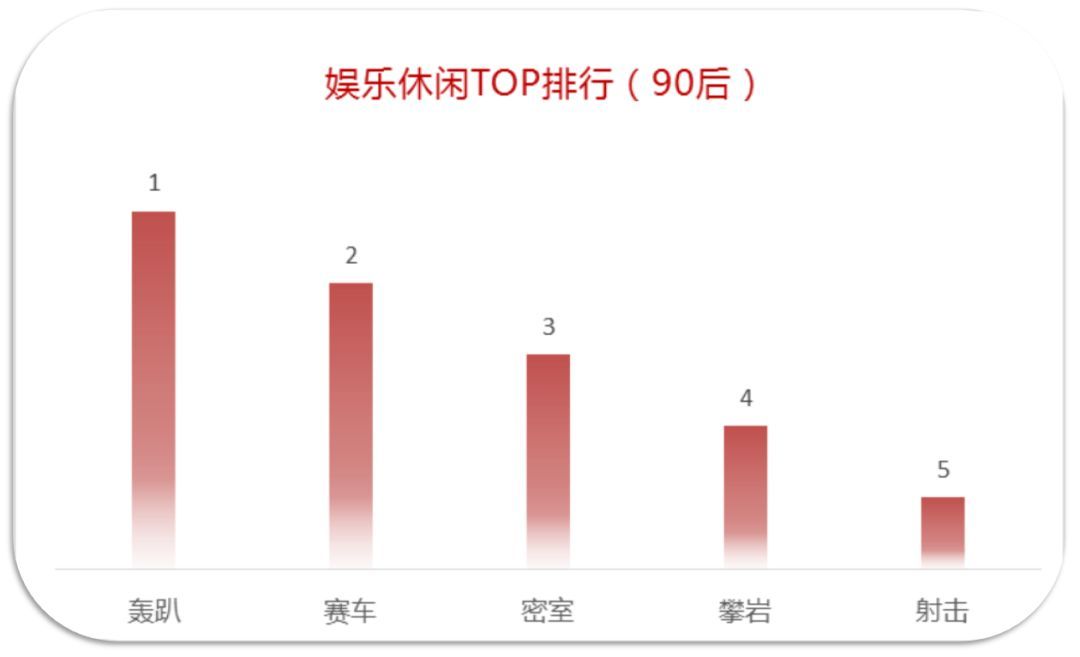 ? 美团新青年讲究玩出新鲜感与个性态度, 90后猎奇心理强,注重“速度”和“刺激”,在90后喜爱的娱乐休闲活动排名中“轰趴”、“赛车”、“密室逃脱”位居前三;