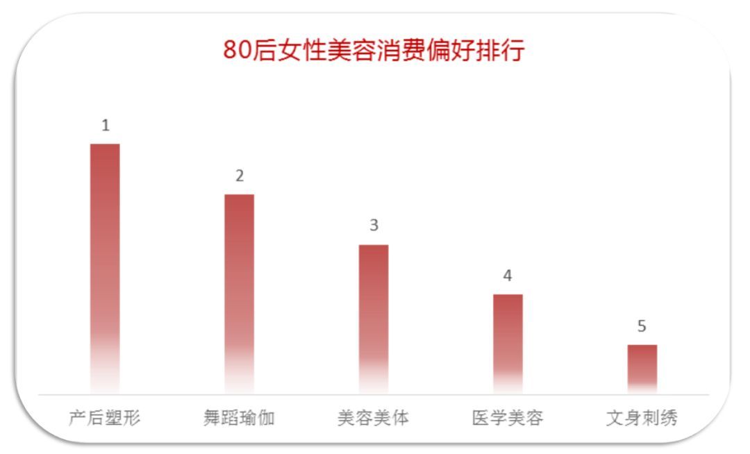 ? 在消费偏好上,80后女性更注重形体保养类消费,产后塑形、舞蹈瑜伽、美容美体成为女性美容消费的TOP 3选项;