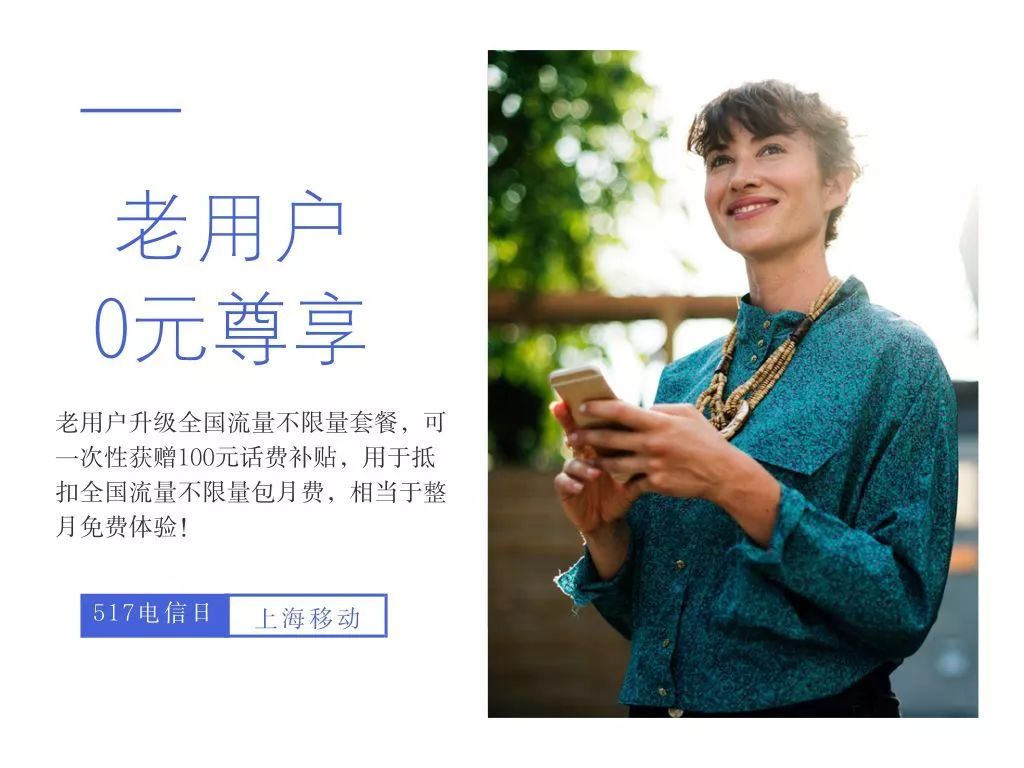 作为移动老用户,517世界电信日福利简直突破天际。5月17日-5月19日三天,上海移动老用户升级全国流量不限量套餐,可一次性获赠100元话费补贴,用于抵扣全国流量不限量包月费,相当于整月免费体验!此外,办理当月还送3GB国内流量。据悉,活动首日申请用户已超4万人。