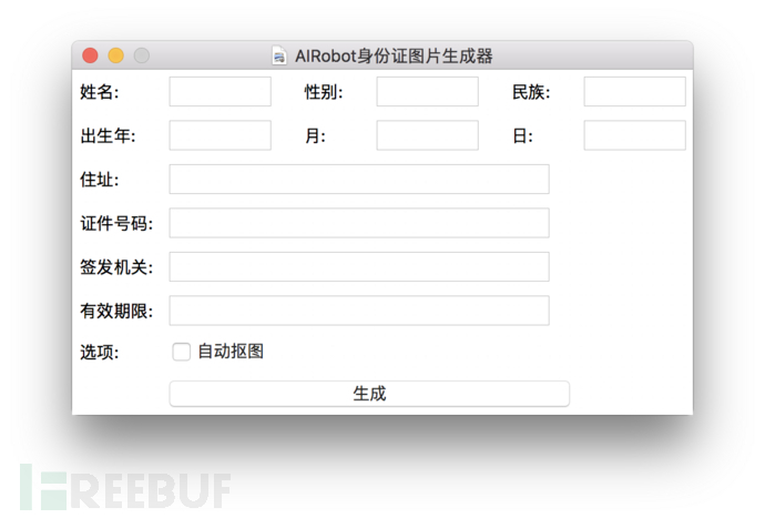 使用tkinter绘制软件界面 root = Tk() root.resizable(width=False, height=False) Label(root, text=u'姓名:').grid(row=0, column=0, sticky=W, padx=3, pady=3) ename = Entry(root, width=8) ename.grid(row=0, column=1, sticky=W, padx=3, pady=3) Label(root, text=u'性别:').grid(row=0, column=2, sticky=W, padx=3, pady=3) esex = Entry(root, width=8) esex.grid(row=0, column=3, sticky=W, padx=3, pady=3) Label(root, text=u'民族:').grid(row=0, column=4, sticky=W, padx=3, pady=3) enation = Entry(root, width=8) enation.grid(row=0, column=5, sticky=W, padx=3, pady=3) Label(root, text=u'出生年:').grid(row=1, column=0, sticky=W, padx=3, pady=3) eyear = Entry(root, width=8) eyear.grid(row=1, column=1, sticky=W, padx=3, pady=3) Label(root, text=u'月:').grid(row=1, column=2, sticky=W, padx=3, pady=3) emon = Entry(root, width=8) emon.grid(row=1, column=3, sticky=W, padx=3, pady=3) Label(root, text=u'日:').grid(row=1, column=4, sticky=W, padx=3, pady=3) eday = Entry(root, width=8) eday.grid(row=1, column=5, sticky=W, padx=3, pady=3) Label(root, text=u'住址:').grid(row=2, column=0, sticky=W, padx=3, pady=3) eaddr = Entry(root, width=32) eaddr.grid(row=2, column=1, sticky=W, padx=3, pady=3, columnspan=5) Label(root, text=u'证件号码:').grid(row=3, column=0, sticky=W, padx=3, pady=3) eidn = Entry(root, width=32) eidn.grid(row=3, column=1, sticky=W, padx=3, pady=3, columnspan=5) Label(root, text=u'签发机关:').grid(row=4, column=0, sticky=W, padx=3, pady=3) eorg = Entry(root, width=32) eorg.grid(row=4, column=1, sticky=W, padx=3, pady=3, columnspan=5) Label(root, text=u'有效期限:').grid(row=5, column=0, sticky=W, padx=3, pady=3) elife = Entry(root, width=32) elife.grid(row=5, column=1, sticky=W, padx=3, pady=3, columnspan=5) Label(root, text=u'选项:').grid(row=6, column=0, sticky=W, padx=3, pady=3) ebgvar = IntVar() ebg = Checkbutton(root, text=u'自动抠图', variable=ebgvar) ebg.grid(row=6, column=1, sticky=W, padx=3, pady=3, columnspan=5) Button(root, text=u'生成', width=32, command=generator).grid(row=7, column=1, sticky=W, padx=3, pady=3, columnspan=4)
