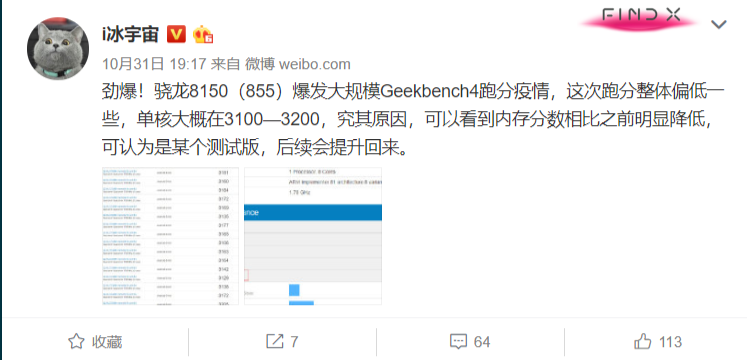 对于这个现象,微博数码博主@i冰宇宙 分析表示,这一批高通骁龙8150芯片单核跑分相对较低,是因为内存分数存在一些异常。说到底,这批搭载高通骁龙8150的产品都是工程测试样机,分数出现不稳定也很正常。