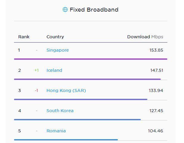 从这份排名来看,排在第1位的是新加坡,平均网速为153.85Mbps。冰岛和中国香港紧随其后,位居第2和第3名,中国澳门则排在第7位,平均网速为87.14 Mbps。