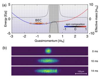 这块BEC被困在一个雪茄状的一维势阱中,福布斯用另外两束激光使铷原子产生自旋轨道耦合(spin-orbital coupling SOC),SOC BEC的能量色散曲线不再是通常的抛物线,而是在临近底部的地方有一个小突起,这个区域的曲率为负,对应着负的等效质量,扩散到这个区域的BEC就相应地有负质量了。