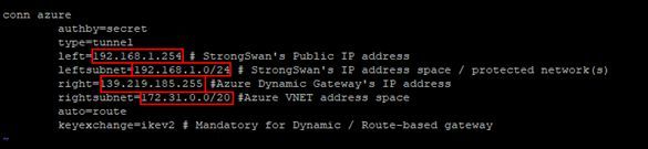 vi /etc/strongswan/ipsec.conf # 注意修改本地网关 IP、本地子网、Azure VPN 网关 IP、Azure VNET 地址空间