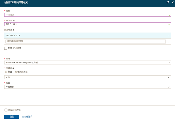 这里的 IP 地址为本地公网出口 IP,地址空间为需要和 Azure 打通 VPN 的子网。