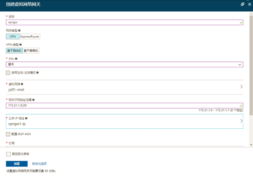 部署前需确认虚拟网络中有空余的地址空间用于创建网关子网,点击“创建”按钮后请耐心等待(页面提示需要 45 分钟)。