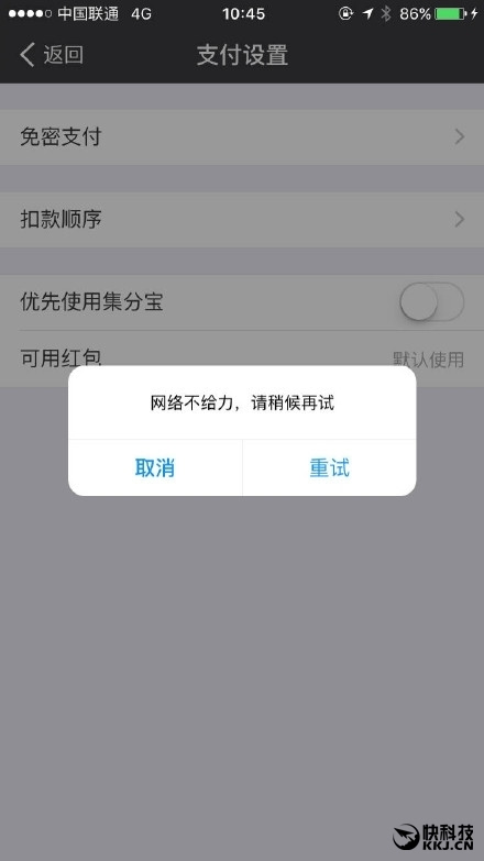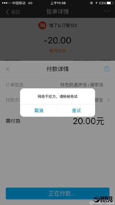 今天上午,有多名网友在微博上反映,使用支付宝转账、支付时出现故障,提示“网络不给力,请稍后再试”的提示,无法操作成功。