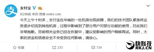 今天上午十时多,支付宝在华南的一处机房出现故障,我们的技术团队紧急将业务逐步切流到其他机房,过程中影响到了部分用户对部分功能的使用,对此我们非常抱歉。目前相关业务已经在恢复中,建议受影响的用户稍候再试。同时,大家的资金和信息安全不会受到任何影响,请放心。