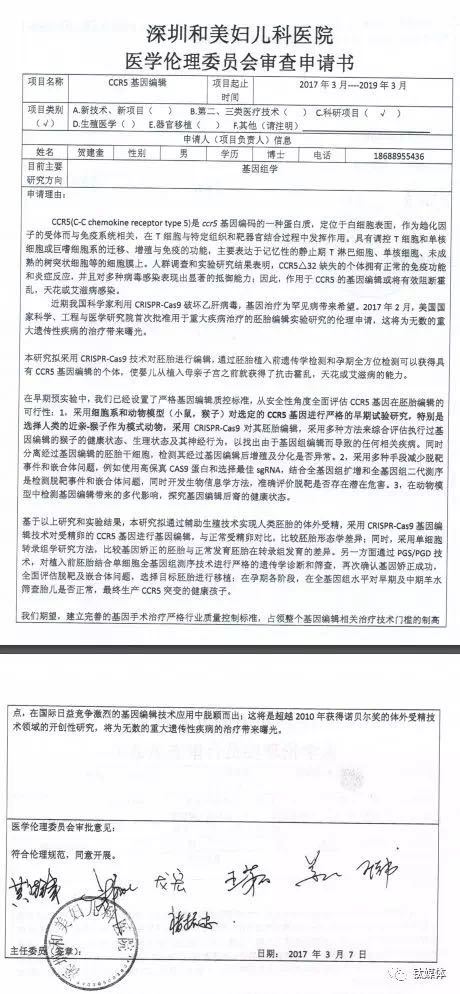 在发布该文章的一个月后,2017年3月,贺建奎递交了一份关于该基因编辑婴儿的伦理委员会审批证明。