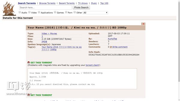 然后,您就可以把种子文件或者磁力链上传到论坛、网站等,等待他人下载了。笔者这里以The Pirate Bay为例: