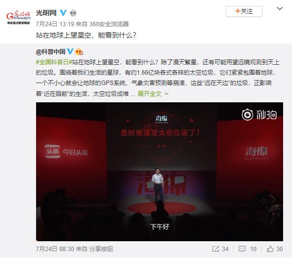 本场海绵演讲还受到了不少政府组织与机构的转发,张伟关于太空垃圾问题的演讲内容被光明网、科普中国、中国气象局及部分地方教育局、交警、公安、党委宣传部、高校等媒体主动转载。