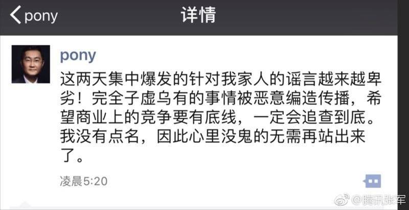 据网上传播的朋友圈截图,马化腾发布朋友圈称:“这两天集中爆发的针对我家人的谣言越来越卑劣!完全子虚乌有的事情被恶意编造传播,希望商业上的竞争要有底线,一定会追查到底。我没有点名,因此心里没鬼的无需在站出来了。”
