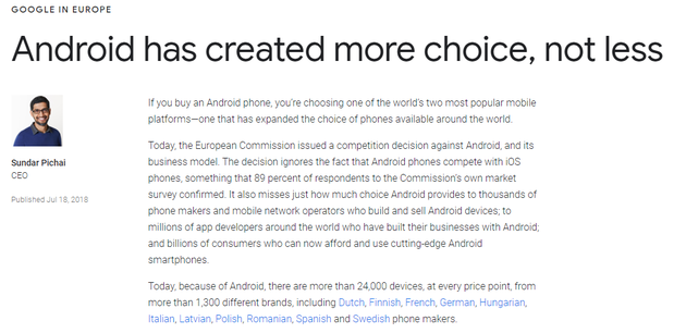@新浪科技【谷歌CEO:欧盟的处罚可能迫使Android无法保持免费】针对欧盟18日作出的50亿美元的罚款决定,谷歌CEO桑达尔·皮查伊随后发表声明称,Android为设备厂商、移动运营商和消费者都提供了更多选择空间,而欧盟的裁决将颠覆Android的业务模式,为此谷歌将提出上诉。