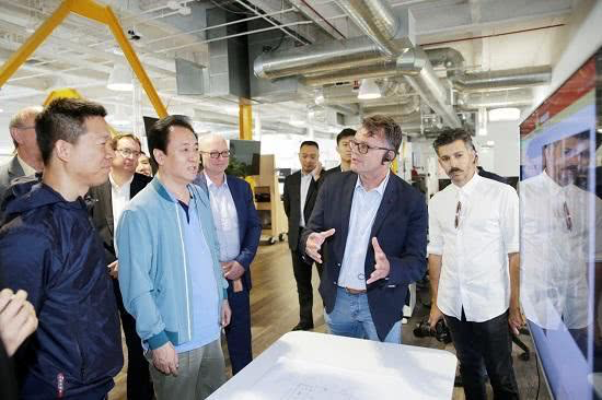 贾跃亭陪同许家印考察FF,与FF全球生产制造高级副总裁Dag Reckhorn(原特斯拉生产制造主要负责人,右二)交流