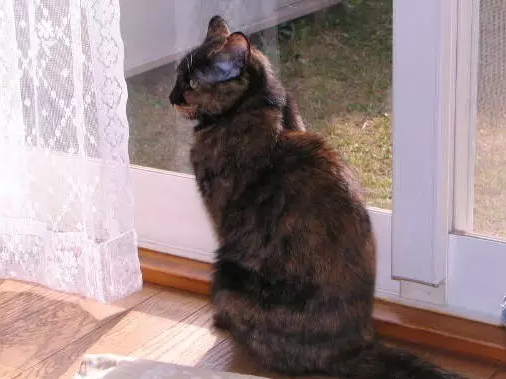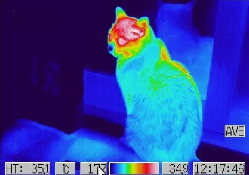 下图是猫咪在便携式热成像设备下的效果,图片中可以清晰地看出显示在头部的发热源。(猫咪可能在思考人生)