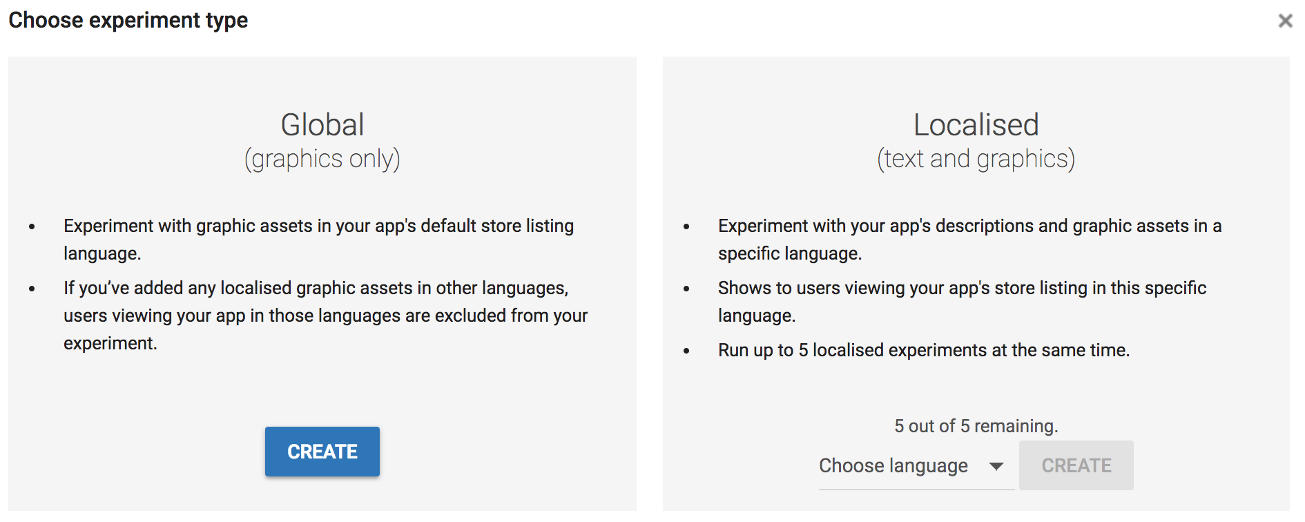 Google Play提供了在APP页面的A/B Test,来对比不同的素材效果。这里有2种方式,Global和Localised,具体的区别如下。